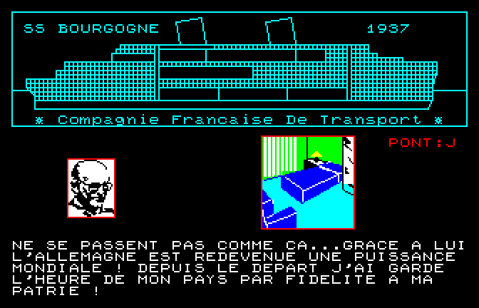 Cytat z gry: „Je déteste cet homme car pendant la guerre, il m’a dénoncé à la Gestapo. Quand je pense qu’à la libération il a pu se faire passer pour résistant!!! D’ailleurs il n’était pas les seul! Je vais vous citer l’exemple de… NOTA — Il n’y a aura pas d’exemples cités car nous n’avons que 48K de mémoire et pas de temps à perdre”.↩︎