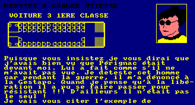 Brocard ograniczył polecenia tekstowe tylko do sytuacji fabularnie uzasadnionych. wpisując ich nazwiska na komputerze podłączonym do sieci Minitel. Używając terminala i języka Basic, można rozszyfrować kod tajnej depeszy, wyjaśniającej okoliczności śmierci senatora Alberta Pérignaca. Ten polityk z komisji śledczej do spraw walki z handlem narkotykami, po powrocie z USA, został zamordowany w pociągu TGV, symbolu francuskiej dumy narodowej. Zadaniem gracza jest przesłuchanie pasażerów i załogi pociągu. Wśród podejrzanych znajdziemy panią Tricot, której wypowiedzi wprowadzają nas w kontekst tej gropowieści:
