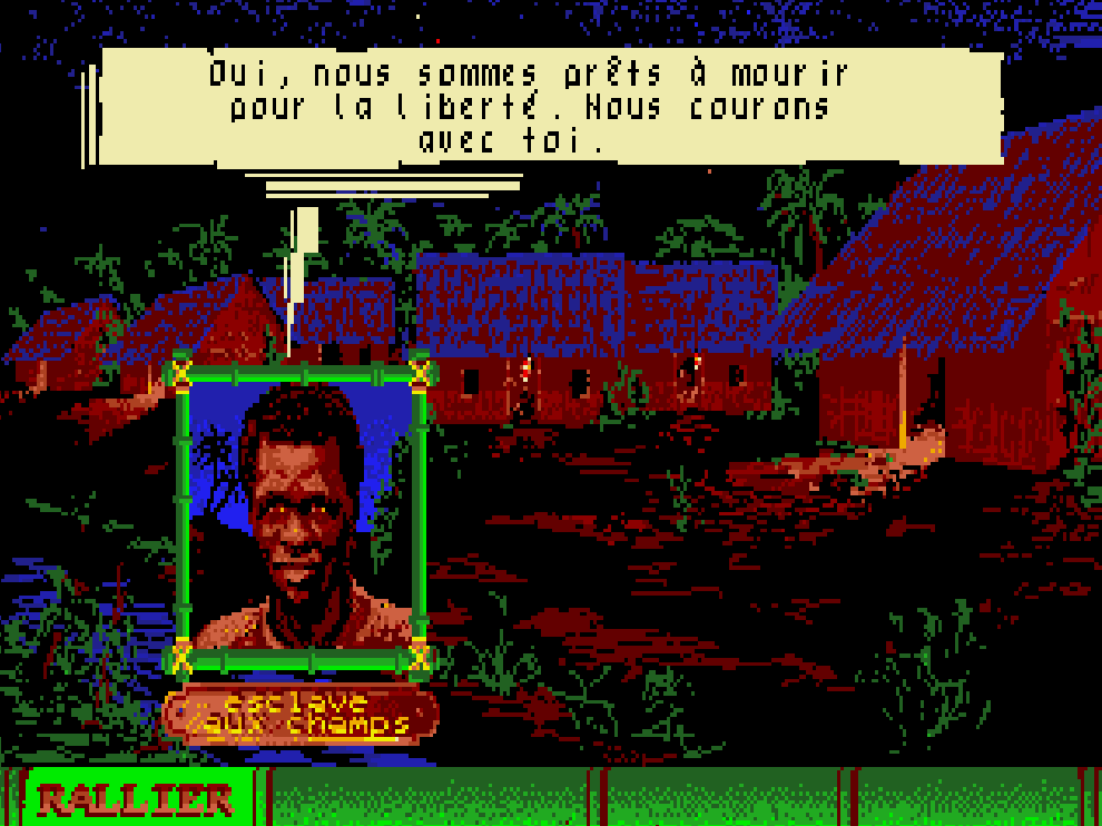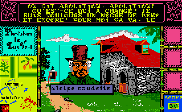Cytat z gry: „On dit abolition, abolition! Qu’est-ce qui a changé ? Je suis toujours un nègre de beké et encore!”. Béké jest słowem kreolskim, oznaczającym białych.↩︎